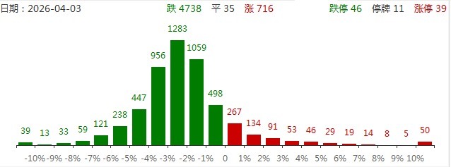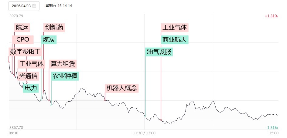 4月3日,市场全天震荡调整,三大指数高开低走,沪指再度跌破3900点关口。大小指数分化明显,中小盘股走势较弱,微盘股指数跌超3.5%。沪深两市成交额1.66万亿,较上一个交易日缩量1865亿。盘面上,市场热点较为杂乱,连续第二个交易日超4000股下跌。跌停个股数量大幅增加,逾20股跌停。从板块来看,算力硬件概念逆势走强,汇源通信2连板,新能泰山9天7板,OCS概念股德科立20cm涨停。算力租赁概念局部拉升,云赛智联、思特奇、直真科技涨停。板块中军“易中天”成交额均突破百亿,其中中际旭创一度涨超7%。
